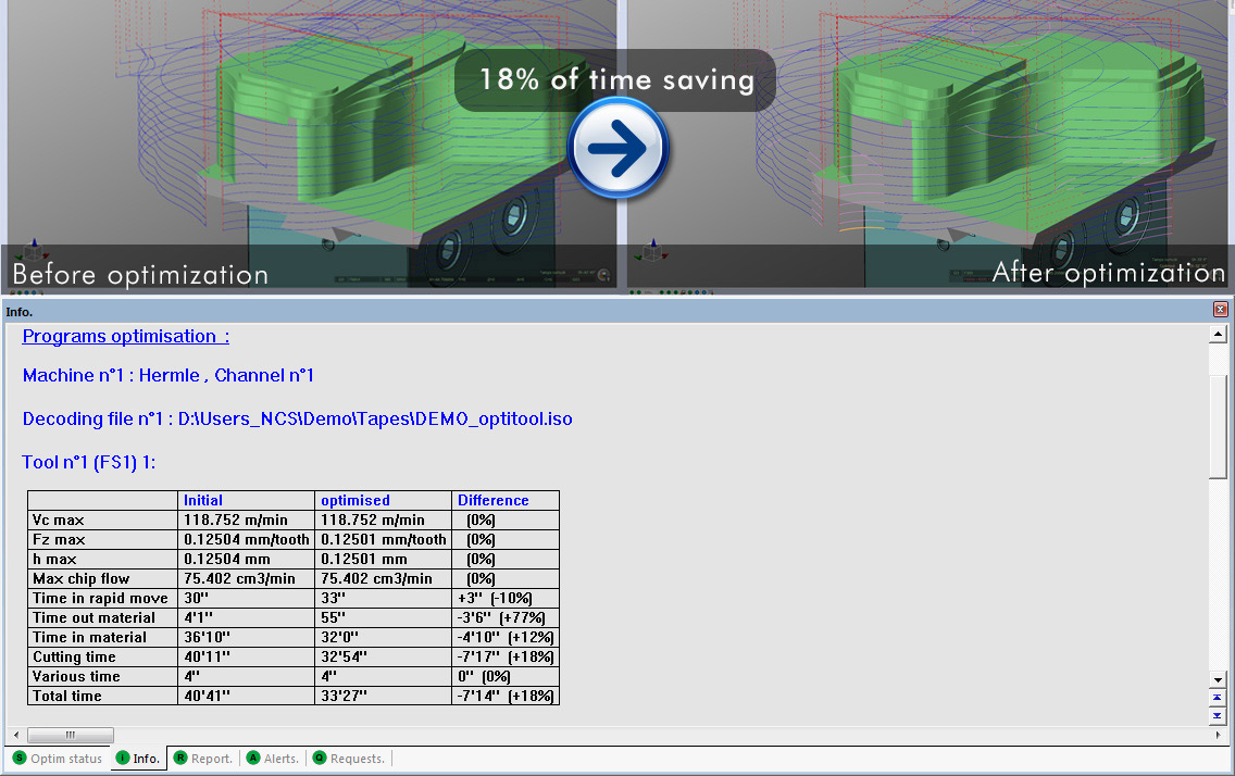 NCSIMUL Optitool analyzuje řezné podmínky, výrazně snižuje “obrábění vzduchu”, optimalizuje rychlosti posuvu a umožňuje uživatelům vytvářet lepší obráběcí strategie. Souhrnnými výhodami jsou: zkrácení produkčního času, zlepšení obráběcích operací a rychlý vývoj optimalizovaných souborů s G-kódy pro budoucí aplikace.
